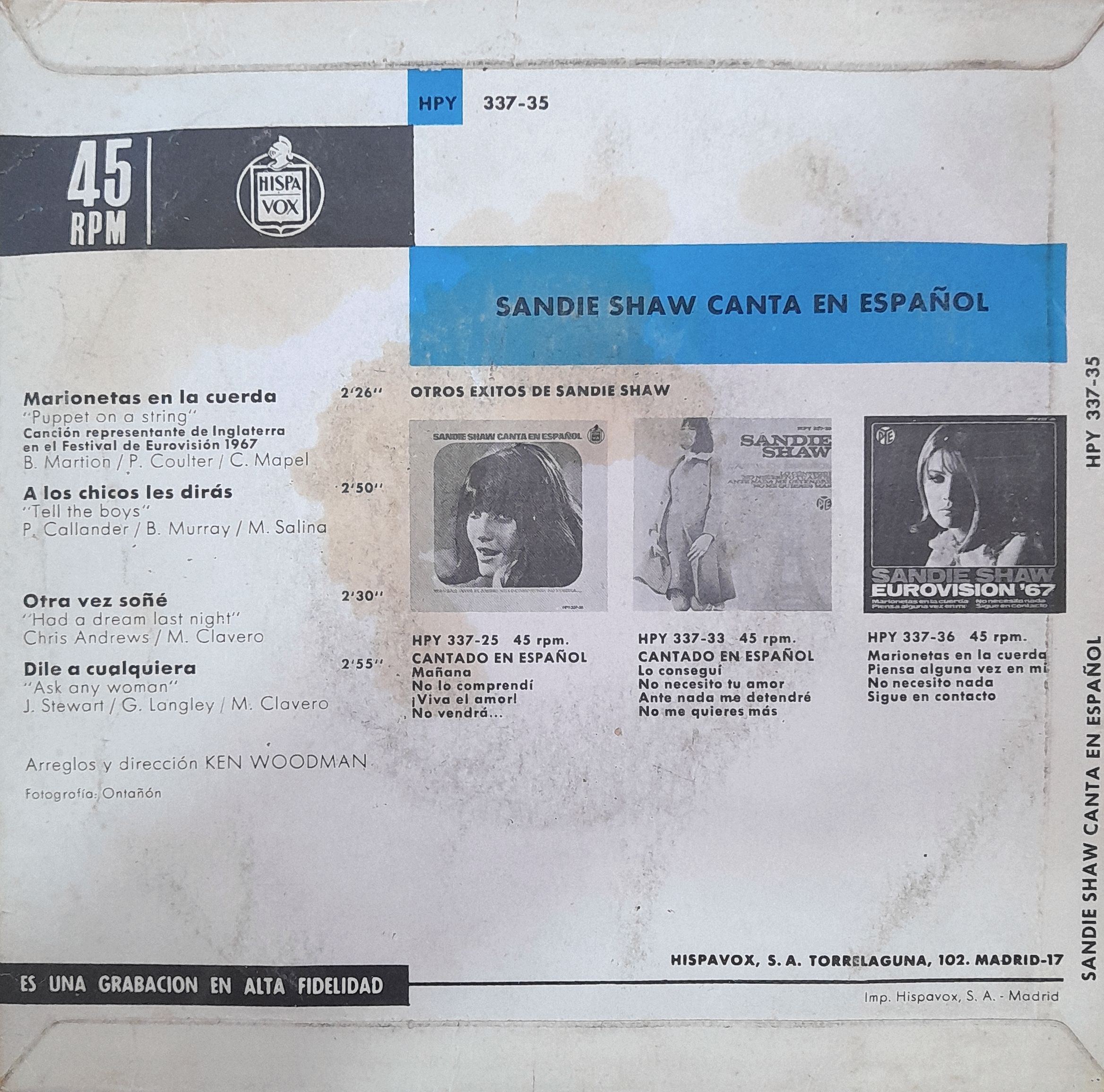 Este vinilo reúne cuatro canciones interpretadas por Sandie Shaw en español —una curiosa y atractiva edición nacional que permite disfrutar de su voz en este idioma, incluyendo su hit ganador del festival Festival de la Canción de Eurovisión 1967, “Marionetas en la cuerda”.
