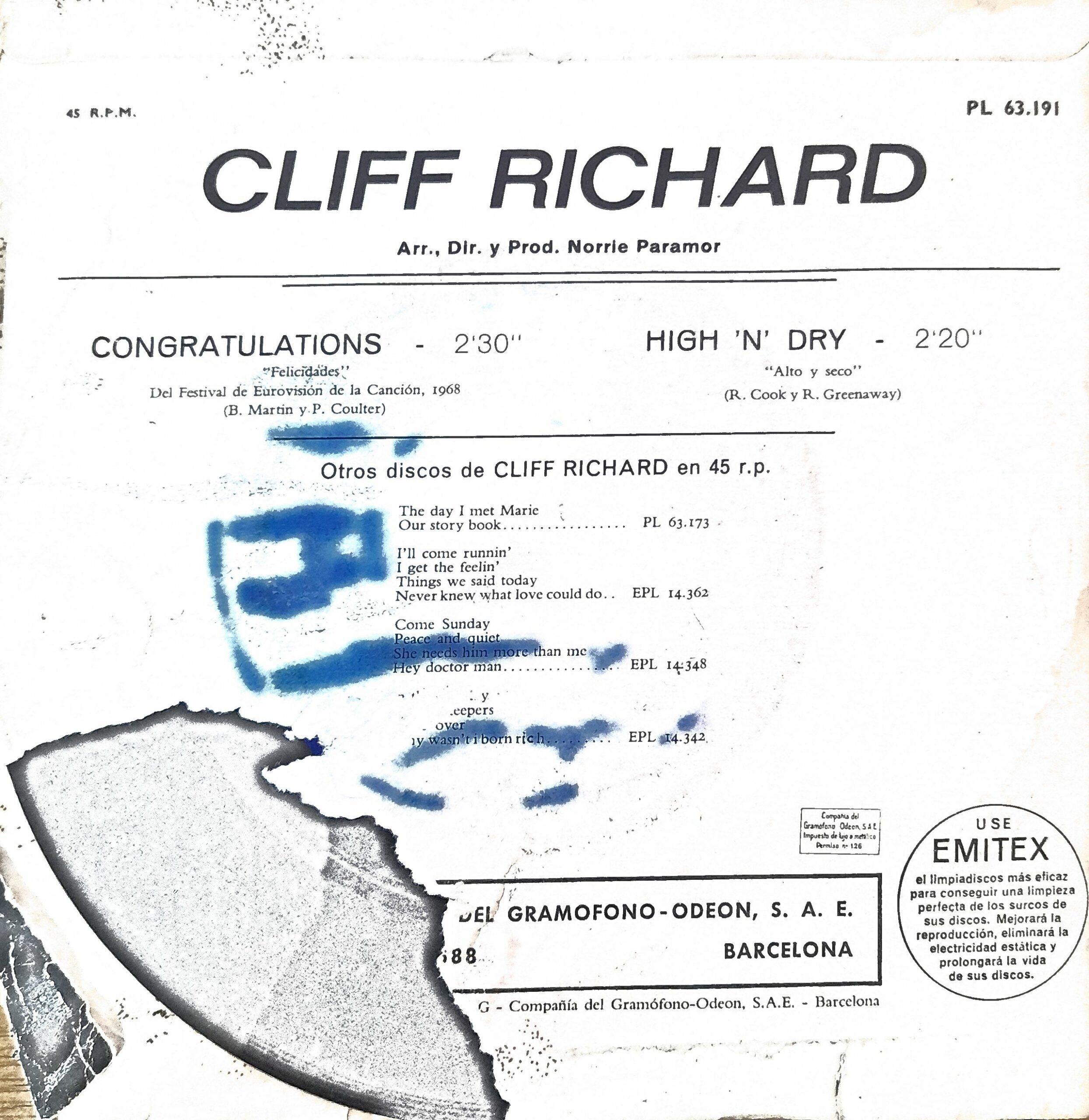 Presentamos este vinilo 7″ single de Cliff Richard, titulado “Congratulations”, editado originalmente en España por La Voz De Su Amo en 1968 (catálogo PL 63.191).