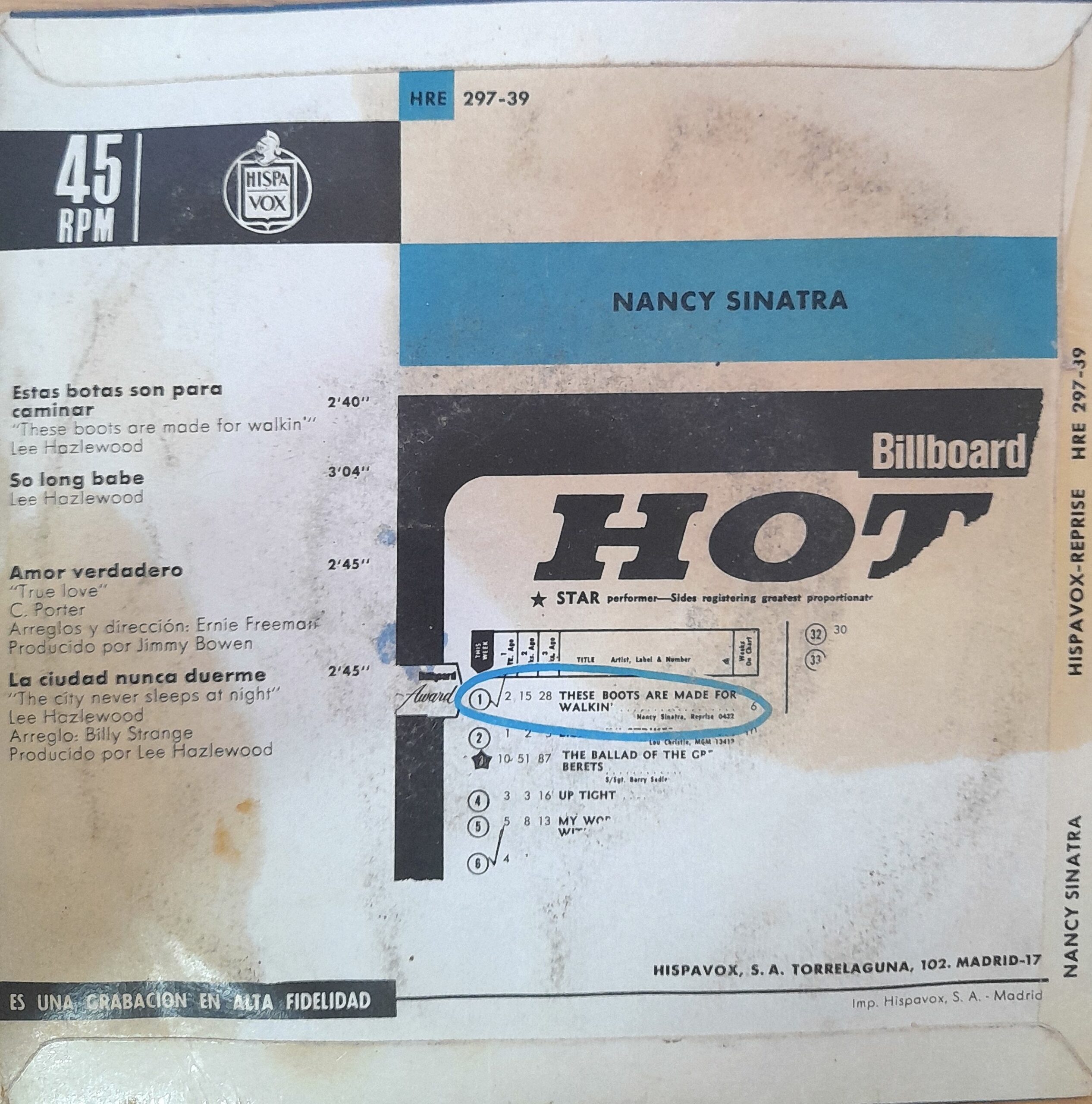 Presento este vinilo 7″ de Nancy Sinatra, con el tema *“These Boots Are Made for Walkin’” (“Estas botas son para caminar”), edición española original de mediados de los años 60. Ideal para amantes del pop-rock internacional clásico, del formato vinilo físico y de piezas con historia.