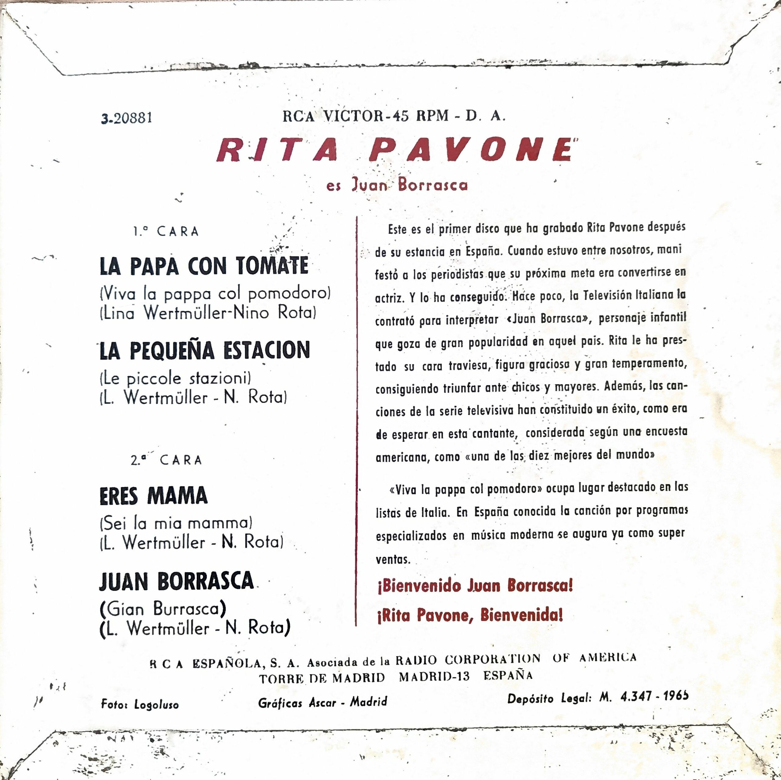Este EP incluye el tema titulado “Juan Borrasca” (versión española de Gian Burrasca) junto a otros tres temas (“Viva la pappa col pomodoro”, “Le piccole stazioni / La pequeña estación”, “Sei la mia mama / Eres mamá”), lo que lo convierte en una edición más rica que un simple single.